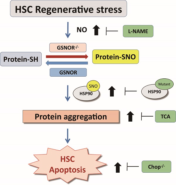 研究人员首先发现,增殖压力下造血干细胞中NO及整体蛋白巯基亚硝基化修饰SNO的水平明显升高,同时伴随着大量蛋白聚集的累积,该结果提示NO及SNO对增殖压力下造血干细胞具有一定的调控作用。研究人员利用调控蛋白质巯基去亚硝基化关键酶GSNOR敲除的小鼠进一步发现,敲除GSNOR对于稳态情况下的造血系统表型没有显著影响。但是,在增殖压力下,敲除GSNOR的小鼠HSC造血重建能力下降,自我更新能力减弱。接下来研究人员通过亚硝基化修饰蛋白组学联用质谱,流式细胞术等方法发现敲除GSNOR的HSC中NO及整体SNO水平明显升高,同时细胞聚集体的累积及细胞凋亡显著增加。为了证明过度激活的NO信号通路诱导GSNOR敲除小鼠HSC重构缺陷的假设,研究人员用NO的抑制剂L-NAME处理,发现GSNOR敲除小鼠的造血重建能力及自我更新能力均明显增强。同时,给予帮助蛋白折叠的分子伴侣TCA处理及在GSNOR敲除小鼠中同时敲除诱导凋亡的Chop基因,均能明显改善GSNOR敲除小鼠的造血重建能力。