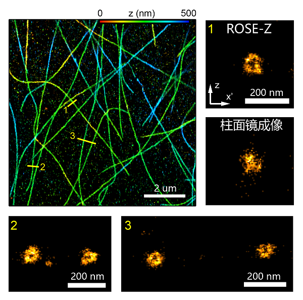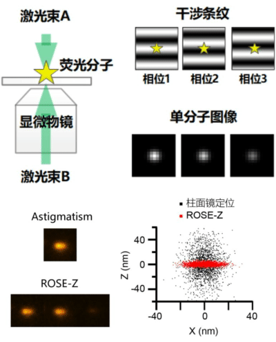 图1. 上图:ROSE-Z定位原理,左下:ROSE-Z与柱面镜成像PSF比较,右下:ROSE-Z与柱面镜成像定位精度比较
