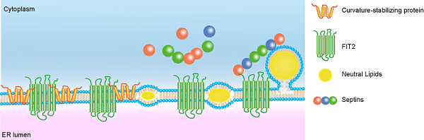 胡俊杰课题组首先利用线虫筛选内质网形态的调控因子,发现内质网整合膜蛋白FIT2(脂肪诱导的跨膜蛋白2)的突变或敲低均会引起片状内质网的扩张,而在细胞中过表达FIT2则形成异常的囊泡样结构,内质网膜曲度稳定蛋白(或称成管蛋白)REEP5、Rtn4以及细胞分隔丝蛋白SEPT2均定位于该囊泡结构上。随后,研究人员通过多种生化实验证实了FIT2与REEP5、Rtn4及分隔丝蛋白SEPT7有特异性相互作用。REEP5、Rtn4及分隔丝蛋白的缺失会引起细胞内脂滴变小、数量减少,且内质网脂滴的新生也变少变慢,说明成管蛋白和分隔丝蛋白参与了脂滴新生的过程。借助多模态结构光超高分辨率显微成像,研究人员观察到活细胞内脂滴新生的过程,发现FIT2、REEP5、Rtn4会在脂滴新生的位置出现短暂聚集,而SEPT7也会动态定位到新生的脂滴上,敲低FIT2会影响新生脂滴与SEPT2的共定位。综合以上结果,研究人员提出了内质网成管蛋白和分隔丝蛋白协同FIT2调控脂滴新生的工作模型(图1),FIT2募集成管蛋白在脂滴新生部位聚集,引发膜曲度,分隔丝蛋白则作为"支架"和"扶手",稳定新生脂滴的定向出芽。