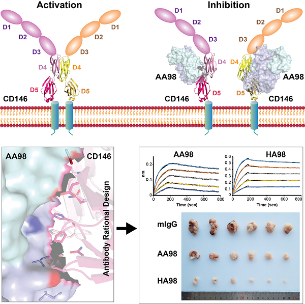 AA98抑制CD146二聚化的机制示意及基于结构解析的抗体亲和力改造