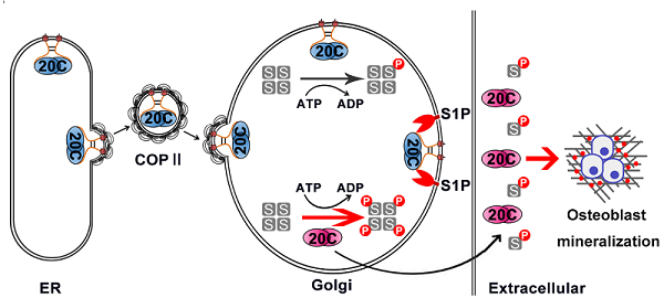 Fam20C的功能缺陷与骨发育不良疾病雷恩综合症密切相关,S1P也被报道参与骨发育过程,但其分子机制一直不清楚。研究人员利用成骨细胞分化模型,阐明S1P介导的Fam20C加工成熟对于骨调素(osteopontin)等分泌钙结合蛋白的磷酸化十分重要,这一事件对于生物矿化过程是不可或缺的。值得一提的是,已知S1P蛋白酶能通过剪切SREBPs调控胆固醇和脂肪酸合成、剪切ATF6调控内质网应激、剪切GNPT调控溶酶体成熟,此项研究进一步拓展了S1P这一重要蛋白酶的生物学功能。