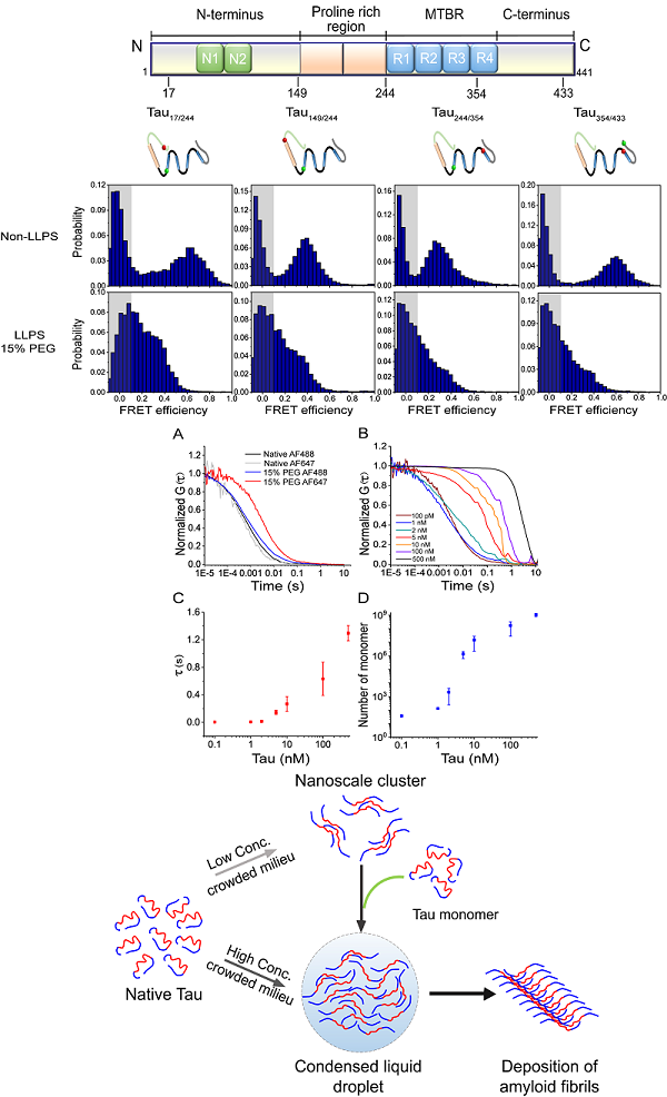 图 单分子FRET和FCS技术研究Tau蛋白在相分离状态下的构象变化及其与不可逆纤维化的关系。