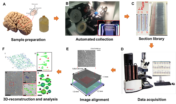 2021年9月2日,《Communications Biology》杂志在线发表了由中科院生物物理所蛋白质科学研究平台生物成像中心(以下简称"成像中心")、丹麦奥胡斯大学、中科院中丹学院共同合作的技术创新成果"Cellular 3D-reconstruction and analysis in human cerebral cortex using automatic serial sections"。该工作在2017年开发的连续超薄切片扫描电镜成像技术(AutoCUTS-SEM,Journal Structural Biology, 2017,200:87-96)基础上,又建立了一种基于连续半薄切片自动收集的光学显微成像(automatic collector of serial sections for Light microscopy,AutoCUTS-LM)三维重构新技术,并通过该技术对储存的人类大脑皮层组织中的锥体细胞进行了三维重构分析。