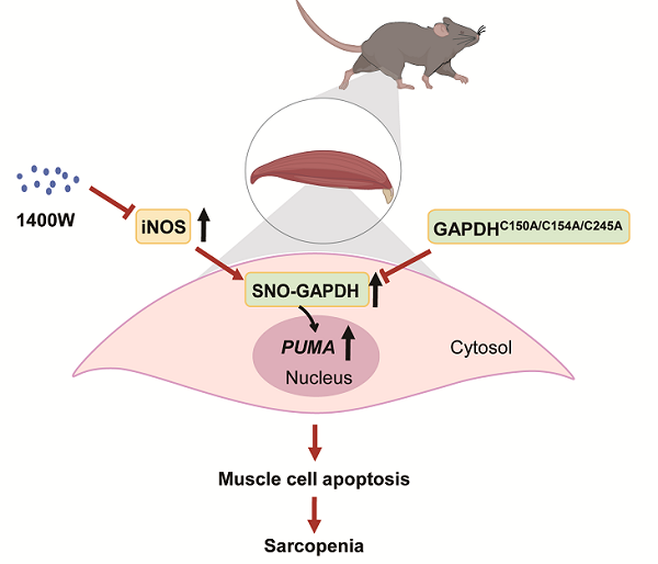 该研究团队首次发现在自然衰老的小鼠骨骼肌中甘油醛-3-磷酸脱氢酶(GAPDH)亚硝基化水平增高;当GAPDH发生亚硝基化后转移至细胞核,从而诱导促凋亡基因p53上调凋亡调节因子(PUMA)高表达,介导骨骼肌细胞凋亡。运用定量蛋白质亚硝化修饰组学分析方法鉴定了在骨骼肌衰老过程中GAPDH(Cys150、Cys154、Cys245)亚硝化位点,将这三个位点突变后GAPDH亚硝基化水平降低,骨骼肌细胞凋亡减少。而且,衰老骨骼肌GAPDH亚硝基化升高是诱导型一氧化氮合酶(iNOS)升高导致,而不依赖于S-亚硝基谷胱甘肽还原酶(GSNOR)、硫氧还蛋白1(Trx1)等去亚硝基化酶,进一步运用iNOS特异性抑制剂1400W,导致GAPDH亚硝基化水平降低,骨骼肌细胞凋亡减少。这项研究首次阐述了GAPDH亚硝基化介导细胞凋亡从而导致衰老性肌少症的新机制,为该疾病的治疗提供了新的思路与靶点。