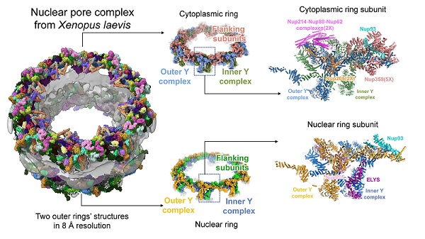 图1 爪蟾核孔复合体外环的精细结构研究揭示了众多蛋白质亚基的组成和相互作用模式。