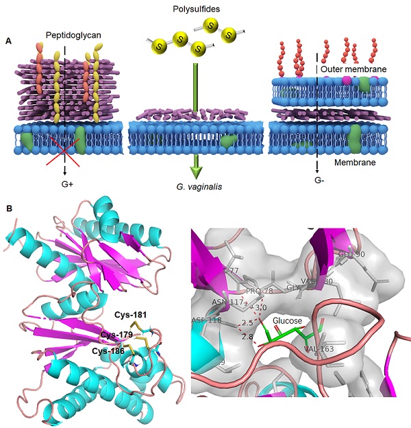 图1.硫化铁释放多硫化物进入加德纳菌内部(A),与糖酵解通路中的葡萄糖激酶活性中心结构的半胱氨酸残基反应抑制其活性(B)。
