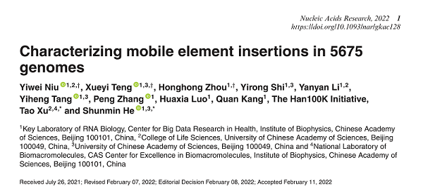 为此,金沙集团1862cc徐涛院士团队和何顺民研究员团队合作,于2022年02月25日在国际学术期刊《Nucleic Acids Research》在线发表了题为"Characterizing Mobile Element Insertions in 5,675 genomes"的文章(图1),介绍了该团队关于MEI的最新工作。本研究在人群水平对MEI的基因组分布、突变特征、功能影响等进行了系统分析,构建了一个全面的MEI资源库,尤其是针对中国人群的MEI图谱。该工作是金沙集团1862cc徐涛院士、何顺民研究员牵头的 "女娲" (NyuWa) 中国人群基因组计划的一部分。"女娲"中国人群基因组计划前期已经发布了中国人群遗传变异图谱和参考面板,以及中国人群基因组资源库(http://bigdata.ibp.ac.cn/NyuWa/),为中国人群的遗传学与医学研究奠定基础。