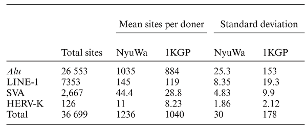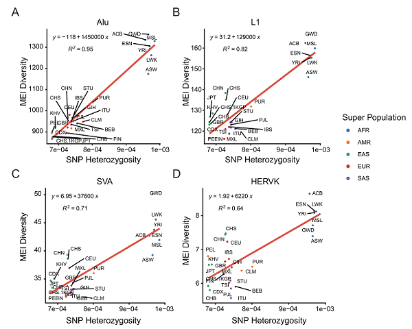 接着,作者分别对两套数据("女娲" 和千人基因组)中 MEI 的突变率(per bp per generation)进行估计,"女娲"数据为 1.609 x 10-11,千人基因组数据为 1.464 x 10-11--二者结果非常接近,大约每16-17个新生儿中会产生1个新的MEI事件。此外,通过比较不同人群中MEI的多样性和SNP的杂合度,作者发现二者表现出很高的相关性,其中非洲人群有着最高的MEI多样性和SNP杂合度(图 4)。