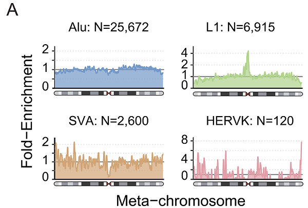 作者使用鉴定的MEI数据分析了MEI的染色体分布,发现L1插入在着丝粒附近区域有着明显的富集。着丝粒DNA附近L1插入变异的富集可能是由于着丝粒附近较多的α卫星序列造成的,相对较低的GC含量更有利于L1的插入。另一方面,考虑到以往研究发现的新着丝粒区域活跃的转座子可能有助于着丝粒的新生,作者认为L1在着丝粒区域的富集也可能存在重要的生物学意义。这一发现有待于后续的研究去探明。