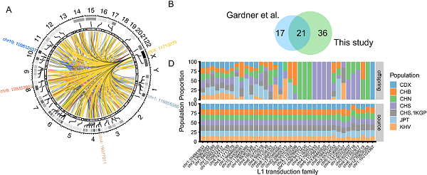 L1的插入通常伴随着3'转导,即把其原来3'末端下游的序列一起插入到新位点中。根据这一特征,作者对L1的source-offspring关系进行了分析,鉴定了一些新的source-offspring关系对,找到了一些潜在活跃的L1位点,并发现了其在不同人群中分布的差异(图6)。