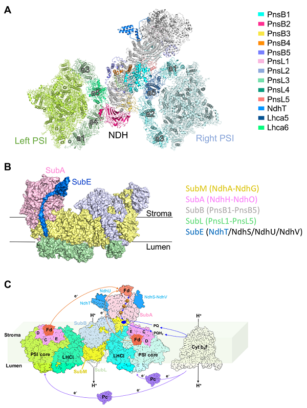 A. NDH-PSI复合物的整体结构;B. NDH的结构;C. 高等植物中NDH依赖的环式电子传递模式图