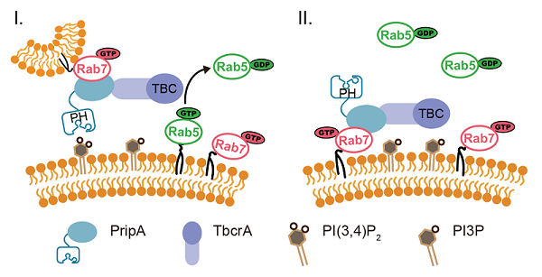 图. Rab5、Rab7和PripA-TbcrA复合体构成的Rab GAP信号级联通路调控巨胞饮体成熟