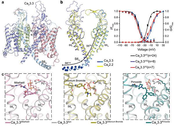 图1:T型钙离子通道CaV3.3低电压激活的关键元件以及与三个小分子药物识别的结构信息