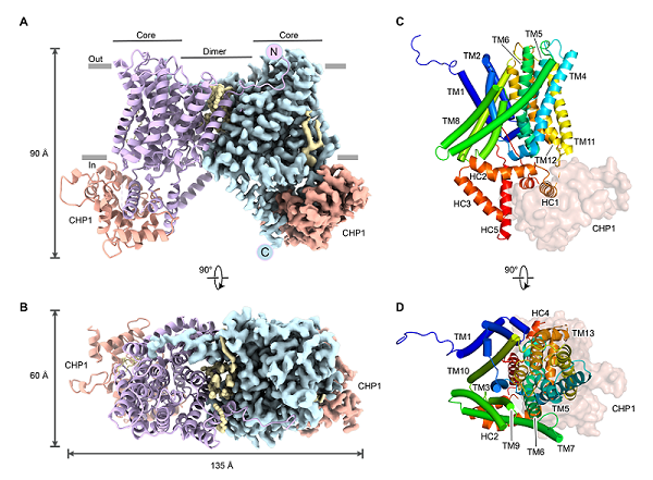 哺乳动物Na+/H+逆向转运蛋白(Na+/H+ exchangers, NHEs)属于CPA1蛋白超家族,在生物膜两侧逆向转运质子和钠离子。NHE家族介导了离子的跨膜电中性转运,在调控胞内钠离子和pH稳态中发挥着重要功能。NHE3在人的胆囊中特异性表达,与胆囊中的水和电解质的吸收,以及管腔质子分泌相关。NHE3转运活性的调控由多种信号分子和调控蛋白参与。其中,神经磷酸酶B-同源蛋白1(CHP1)是NHE3蛋白发挥功能所必需的调控亚基,并与NHE3形成复合物。当NHE3活性降低时,胆囊吸收胆汁减少,从而使胆囊浓缩胆汁功能下降,诱发胆囊胆固醇结石等疾病的发生。NHE3功能的失调导致的人类疾病还包括胆汁淤积、囊性纤维化、溃疡性结肠炎、腹泻和肠易激综合症等。