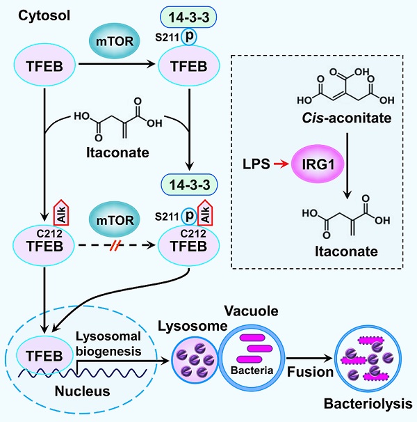 图. 在细菌感染的条件下,脂多糖(LPS)激活的巨噬细胞表达衣康酸合成酶IRG1,在线粒体中IRG1将顺乌头酸(cis-aconitate)转化为衣康酸(itaconate)。随后衣康酸在胞质中对转录因子TFEB进行烷基化修饰,该修饰能够阻止蛋白激酶mTOR对TFEB进行磷酸化修饰并破坏已被mTOR磷酸化修饰的TFEB与14-3-3结合,导致TFEB从胞质转移至细胞核。在细胞核内TFEB激活溶酶体的生物合成,提高巨噬细胞清除入侵细菌的先天免疫能力。