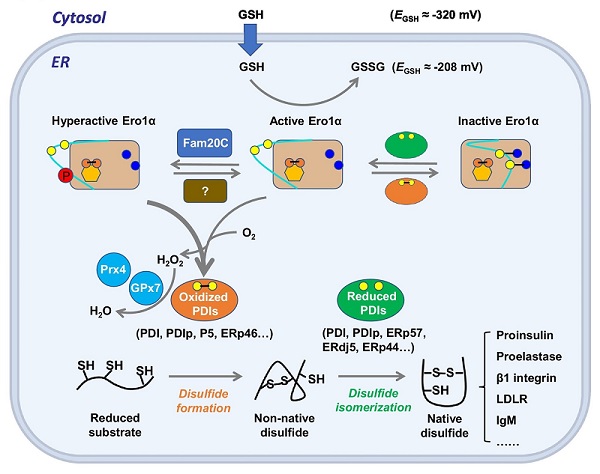 真核细胞中约1/3的蛋白质是分泌蛋白和膜蛋白,这些蛋白质往往富含二硫键。新生肽链中二硫键的形成过程被称为蛋白质氧化折叠。内质网拥有一整套包括折叠酶和分子伴侣在内的"质量控制"系统为蛋白质氧化折叠提供了保障。此外,内质网腔偏氧化的环境有利于二硫键形成,例如内质网的谷胱甘肽还原电位(EGSH)约为-200 mV,远高于胞浆(约-300 mV)。然而,内质网氧化还原稳态失衡和未折叠/错误折叠蛋白异常积累极易导致内质网应激和相关疾病。因此,研究细胞如何保证蛋白质氧化折叠的高效性和保真性,以及如何维持内质网氧化还原稳态,具有十分重要的科学意义。