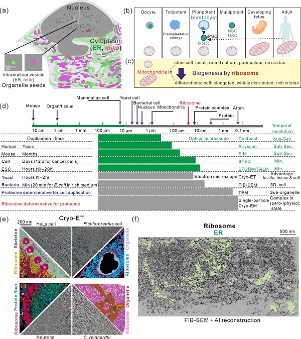 图:细胞器的发生:核糖体作为组织者和实施者。(a)细胞器的种子可能在细胞核里。(b)干细胞分化过程中线粒体的变化暗示线粒体生物发生过程。(c)核糖体作为蛋白质的生产者和定位的组织者,在线粒体等细胞器的发生中发挥核心功能。(d)生物过程的时间、空间尺度与成像方法。(e)电镜下的细胞内部主要可见核糖体与细胞器。(f)人工智能算法优化后的细胞内部(黑色:核糖体,绿色:内质网)。