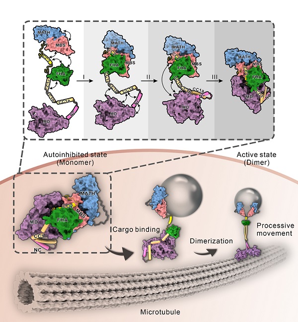 多年来,冯巍课题组一直致力于驱动蛋白激活与自抑制分子机制的研究。通过生化和细胞生物学手段,已提出kinesin-3家族蛋白二聚化的结构模型,并揭示其由马达结构介导的自抑制机制。然而,由于全长蛋白结构模型的缺失,大家对于驱动蛋白激活和抑制状态的认知还不够完整。