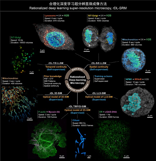 合理化深度学习超分辨显微成像方法能够适用于包括2D-SIM、3D-SIM、LLSM等在内的多种显微成像模态,提供高分辨率、高保真的显微图像重建性能,相较于传统方法最多可以提升30倍的成像时程和10倍的成像速度。借助rDL成像技术,研究团队进行了诸多过去的成像手段无法开展的超分辨活体成像实验,并与HHMI, Lippincott-Schwartz博士,中科院分子细胞科学卓越中心朱学良研究员、中科院遗传发育所何康敏研究员一起深入探讨了其潜在的生物学意义,包括: