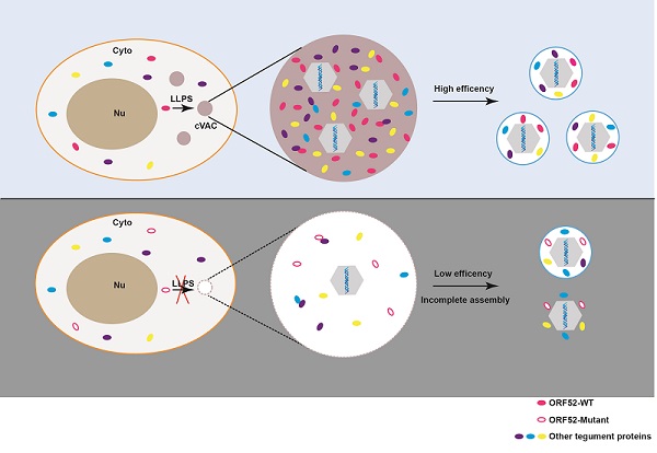 模式图. ORF52通过液-液相分离机制介导病毒组装区间的形成,促进疱疹病毒组装