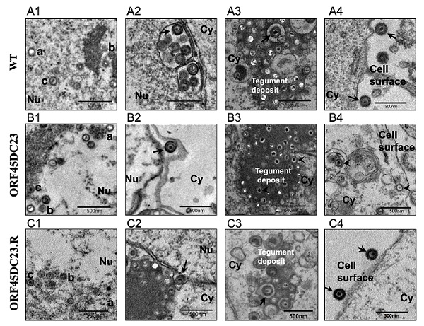 为进一步探究ORF33-ORF45相互作用在MHV-68成熟过程中的功能,研究人员鉴定出ORF45 C端23个氨基酸对于其与ORF33的相互作用至关重要。接下来,研究人员通过细菌人工染色体(BAC)技术在病毒基因组水平上构建了ORF45 C端23个氨基酸缺失的突变体病毒(ORF45DC23),发现ORF45 C端23个氨基酸对于ORF33向细胞核内的转移以及产生有感染力的病毒粒子是必需的。通过电镜观察病毒形态发生过程发现,ORF45 C端23个氨基酸对于病毒在细胞质中的成熟是必需的。此外,研究人员也鉴定出ORF33 N端17个氨基酸对于其与ORF45的相互作用至关重要,并且ORF33 N端17个氨基酸对于ORF33的定位以及病毒在细胞质中的成熟是必需的。