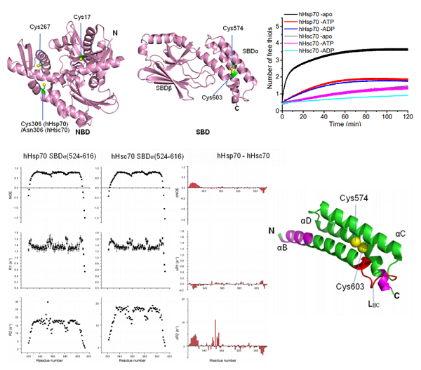 人源应激型Hsp70(hHsp70)和人源保守表达的Hsp70(hHsc70)的半胱氨酸残基分布、巯基活性差异性,及其SBDα结构的动力学特性差异。