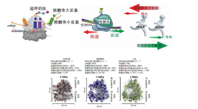 (A) 核糖体以信使RNA(mRNA)为模板,氨酰化转运RNA(aa-tRNA)为底物,合成蛋白质的工厂。(B)tRNA在核糖体内移动,是蛋白质合成工厂中生产线上的物流【3,4】 (C)核糖体的基本结构与细胞内拷贝数、占有物质的比例【1】