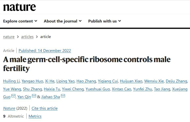 2022年12月14日,南京医科大学沙家豪、郭雪江团队与中科院生物物理所秦燕团队合作在Nature上发表了文章 “A male germ-cell-specific ribosome controls male fertility”,发现精子发生中的新型核糖体(RibosomeST)能够产生精子特异蛋白组。