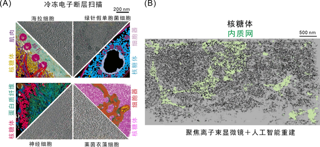 图2.(A)冷冻电子显微镜呈现的不同细胞原位状态下的核糖体。(B)聚焦离子束显微镜结合人工智能技术重塑细胞成分。【3】