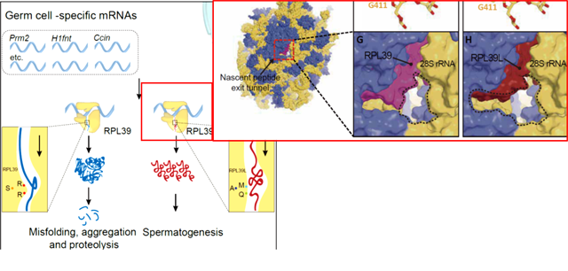 在雄性生殖细胞中,核糖体大亚基蛋白L39,在精子发生的减数分裂后会发生转移并使用L39L的形式在核糖体上。该研究发现L39是核糖体大亚基新生肽链通道上的重要成分,L39L替换L39后,这个通道可以变宽很多,有利于精子成熟中大量正电蛋白的产生。那么核糖体L39如何决定精子生殖蛋白组?