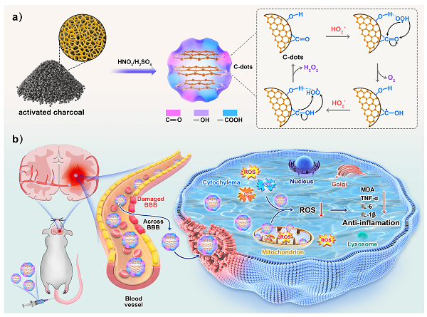 图:(a)碳点SOD纳米酶的制备、催化机制及(b)其在缺血性中风治疗中的应用