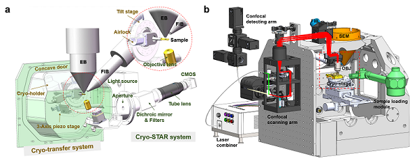 其中ELI-TriScope系统在双束扫描电子显微镜内部整合了一个基于冷冻样品杆的传输系统(cryo-transfer system),以及一个内嵌的光学成像系统(cryogenic SimulTAneous monitoR system, cryo-STAR)。该系统在扫描电镜的内部将电子束,光束和离子束同时聚焦在样品台上同一位置,实现了聚焦离子束减薄样品的同时进行荧光实时监控成像。该系统通过监测目标分子的实时荧光信号,能够精确且高效地制备包含目标结构的冷冻含水切片。