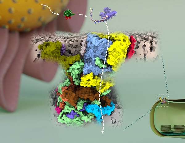 图1:叶绿体TOC-TIC超复合体负责将胞质中合成的前体蛋白转运进入叶绿体。超复合体中的不同蛋白质亚基着以不同的彩色加以区分,灰色部分为内膜和外膜的一部分。背景的左上角为细胞核和内质网,右下角为叶绿体的一部分。