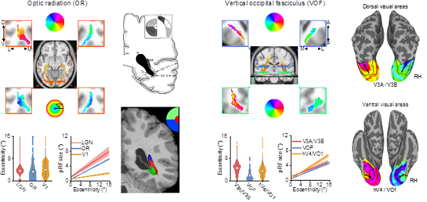 视放射(OR)连接视觉丘脑外膝体(LGN)和初级视觉皮层(V1),而垂直枕束(VOF)连接腹侧(hV4/VO)和背侧视皮层(V3A/V3B)。pRF模型对7T白质fMRI信号的分析清楚揭示了OR和VOF表征对侧视野的功能图谱。在纤维束的横切面上,OR的背侧、中间和腹侧部分分别表征下视野、中央视野和上视野,与OR的解剖结构和纤维束追踪的结果高度一致;而VOF的背侧和腹侧部分表现出了反转的视野图谱,与连接的背侧和腹侧视觉皮层的视野图谱相匹配。另外,白质纤维束还表现出了与所连接的灰质区域类似的视野编码特性,包括中央视野偏好,以及感受野大小随离心度增加等。相较于灰质区域,视觉白质的血液动力学响应函数(HRF)更慢更宽。视觉白质的视野图谱不但能够在群体水平数据上获得,也能够在个体水平数据上清晰的观察到。