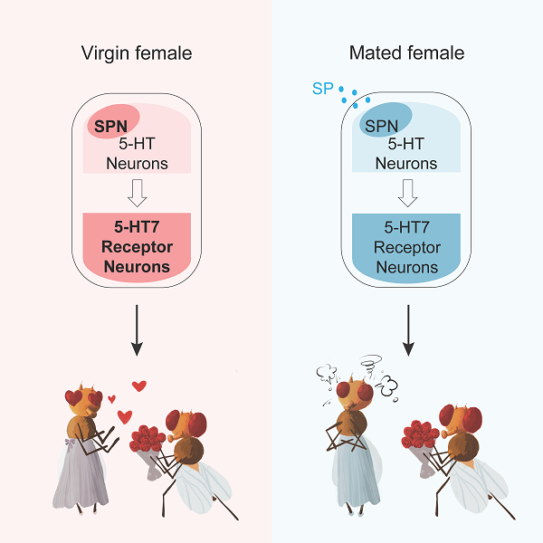 在果蝇中,当雌雄果蝇相遇时,雄蝇会对雌蝇展开猛烈的追求。它会快速靠近雌蝇并紧随其后,用单边翅膀"唱"出求偶歌,随后用喙去舔舐雌蝇尾部。此时,若是雌蝇愿意接受雄蝇的求偶,则会从被雄蝇追求的高速移动中减速并停下来,并将生殖板打开。雄蝇则会弯曲腹部尝试交配,直到开始交配为止。在交配过程中,雄蝇会传递一种物质--性肽(sex peptide, 简称SP)至雌蝇体内,使得交配后雌蝇的行为发生显著变化,如未交配过的处女雌蝇在接受雄蝇求偶时,交配成功率高达90%以上,而交配后雌蝇在接下来几天内不再接受雄蝇的求偶。近期有研究表明脑中五羟色胺系统参与调节雌蝇接受性,药理学实验也发现五羟色胺受体的拮抗剂能降低雌蝇接受性,但五羟色胺系统在雌蝇接受性相关神经环路中是如何起作用的仍是未知。
