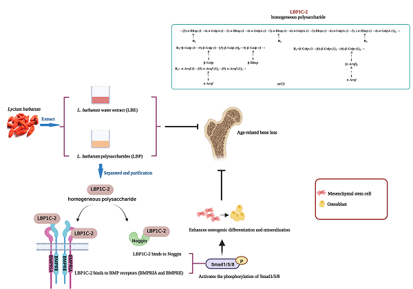 枸杞子是我国传统名贵中药,《神农本草经》把它列为上品,历代本草均有记载。宁夏枸杞(Lycium barbarum L.)为茄科枸杞属植物宁夏枸杞的果实,是中药枸杞子道地药材。作为典型的药食同源中药,枸杞子一直被纳入在国家卫健委发布的既是食品又是中药材的物质目录中。《本草纲目》中记载枸杞子具有"久服坚筋骨,轻身不老,耐寒暑"的功效。陈畅课题组前期研究揭示了枸杞水提物通过激活PKA-CREB通路上调雌激素相关受体ERRγ从而增加氧化型肌纤维类型增强肌肉功能的"坚筋"功效的科学内涵(FASEB Journal. 2020 34(9):11460-11473.)。2023年2月23日,中科院生物物理研究所陈畅课题组与中科院上海药物研究所丁侃课题组合作,在《Carbohydrate Polymers》杂志在线发表了题为"LBP1C-2 from Lycium barbarum alleviated age-related bone loss by targeting BMPRIA/BMPRII/Noggin"的研究论文,揭示了枸杞子通过促进骨形成改善衰老性骨流失而发挥"坚骨"功效的物质基础、作用机制和作用靶点,解析了枸杞子"坚骨"功效的科学内涵。