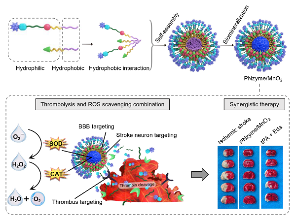 这种新型纳米酶的设计理念:是将两种多肽链混合自组装形成直径为15 nm的纳米颗粒,其表面多肽包含靶向溶栓模块、凝血酶响应模块、血脑屏障穿越-脑缺血组织神经元靶向模块,并以内核的金属离子亲和肽为模板通过生物矿化合成MnO2纳米酶,结果表明,此多肽抗氧化纳米酶具有与天然酶相当的SOD (>2100 U/mg)和CAT (~300 U/mg)催化活性。这种多肽抗氧化纳米酶的工作原理是依次从外向内发挥靶向溶栓和清除ROS的功能。首先,外表面的多肽能够特异结合血栓中的纤维蛋白,在凝血酶响应下释放溶栓肽,从而启动溶栓活性,进而靶向血脑屏障转铁蛋白受体,进入缺血缺氧脑组织,在此纳米酶发挥SOD和CAT双酶级联效应,即SOD将O2·-转化为H2O2和H2O,CAT将高细胞毒性的H2O2最终转化为无毒性的H2O和O2,安全有效地消除ROS。这种多肽抗氧化纳米酶在小鼠和大鼠缺血性脑卒中模型中表现出显著的神经功能恢复,梗死体积减少超过90%,治疗效果明显优于临床应用的溶栓药组织型纤溶酶原激活剂(tPA)和神经保护药伊达拉奉(Eda)。其原因是多肽具有的多功能性的优势使纳米酶精准靶向脑卒中缺血组织,保证了生物安全性,同时纳米尺度的治疗体系使纳米酶在较长时间内发挥级联类酶活性,克服了目前小分子药物半衰期短、生物利用度低和严重毒副作用导致疗效有限的问题,为缺血性脑卒中的综合、安全、有效治疗提供了新思路。