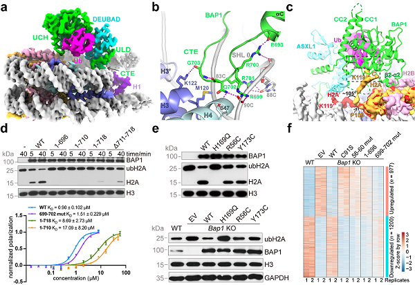 研究人员通过解析PR-DUB结合核小体的3 Å分辨率的冷冻电镜结构,发现BAP1富含正电荷的CTE结构域上的699-706残基形成一个手指状结构,识别核小体内环对称轴(SHL0)附近DNA磷酸骨架,碱基基团以及组蛋白H3-H4氨基酸残基。在BAP1的UCH催化结构域上,研究人员发现第56-60位的高度保守富含精氨酸序列(RRSRR)与核小体上的酸性区域相互作用,这种双位点结合模式将BAP1/ASXL1稳定地锚定在核小体盘面上。ASXL1作为激活亚基与BAP1一起构成了完整的泛素结合位点。另外,两者的结合还帮助BAP1 CTE正确定位在核小体上。更为重要的是,研究人员发现BAP1活性中心远离常规的H2AK119位点,泛素与BAP1/ASXL1结合,带着H2A C端尾巴向核小体盘面翘起,使得H2AK119与泛素C端的共价异肽键结合在BAP1的催化中心,清晰地展示了BAP1对于核小体上H2AK119底物特异性的结构基础。基于结构信息,研究人员设计了相关的体外去泛素化酶活实验和细胞实验验证了PR-DUB与核小体相互作用界面的关键氨基酸的重要性,明确了激活亚基ASXL1在BAP1酶活调控中的重要作用;同时在作用界面关键区域选取了一些BAP1与癌症相关的错义突变进行去泛素化酶活实验及细胞实验,发现这些突变会造成BAP1酶活不同程度的下降。