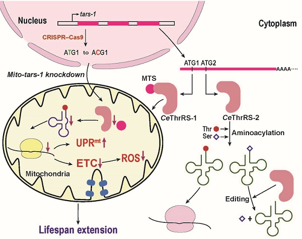 研究人员首先分析了线虫(C. elegans) ThrRS的基因与蛋白质形式,发现线虫只有一个潜在的ThrRS基因tars-1, 但却注释两种不同长度的ThrRS;通过RT-PCR以及5'-RACE方法证明在线虫体内,只有一种tars-1 mRNA,可能利用翻译重起始产生两种形式的ThrRS; 利用在哺乳动物细胞中的荧光定位实验,明确长形式ThrRS (CeThrRS-1)与短形式ThrRS(CeThrRS-2)分别定位于线粒体与细胞质中;通过构建两种酵母遗传学突变株,体内证明tars-1通过翻译重起始产生CeThrRS-1以及CeThrRS-2,它们分别在线粒体与细胞质蛋白质合成中发挥作用;以CeThrRS-2为研究对象,系统研究了其介导的细胞质与线粒体tRNA氨基酰化反应的机制,并阐明了其催化的蛋白质合成质量控制机制。为了研究线粒体tars-1的生理功能,通过CRISPR-Cas9得到线粒体tars-1敲低的线虫品系,发现线粒体tars-1敲低线虫出现发育迟缓、运动能力下降、产卵下降、寿命延长的表型,进一步研究发现线粒体功能受损:耗氧率降低、复合物Ⅰ活性下降、线粒体出现还原应激,UPRmt被激活,而线虫寿命的延长依赖于UPRmt的激活。进一步敲低线虫及哺乳动物细胞中多种线粒体aaRS,发现都能激活UPRmt,说明线粒体aaRS缺陷相关线粒体翻译功能受损激活UPRmt具有普遍性及物种间的保守性。