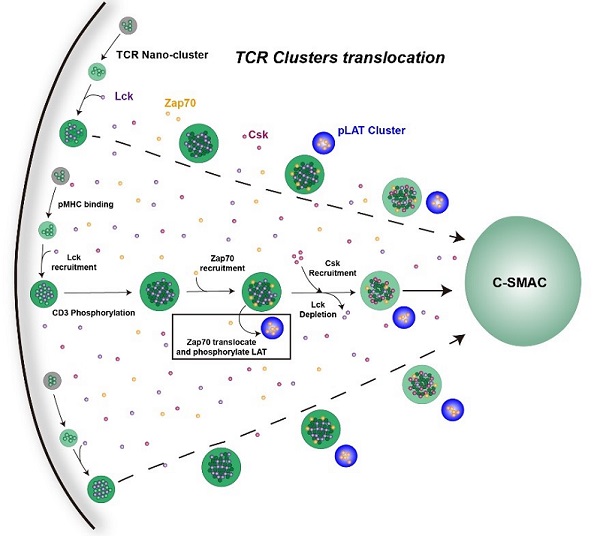 T细胞是适应性免疫的重要组成部分,TCR复合体作为T细胞膜表面最关键的膜受体,可以识别呈递外源抗原的MHC复合体并介导T细胞的激活以及对靶细胞进行清除。T细胞的激活过程具备三个主要特征:高特异性、高敏感性以及快速性。娄继忠以及陈伟课题组的早期研究发现TCR与不同的pMHC形成的复合体具备独特的力学性质,这使得TCR可以特异性的识别外来抗原。然而T细胞响应抗原的高敏感性以及快速性的机制仍不够清楚。