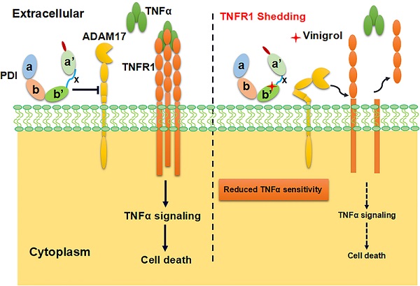 图1 Vinigrol的作用机制模式图。正常情况下,细胞膜表面PDI蛋白通过异构ADAM17蛋白酶使其失活,导致TNFR1受体无法被有效剪切,TNF-α信号正常转导; vinigrol通过作用于PDI,解除了其对于ADAM17的抑制,导致膜上TNFR1被持续剪切,受体密度下降无法响应TNF-α刺激。