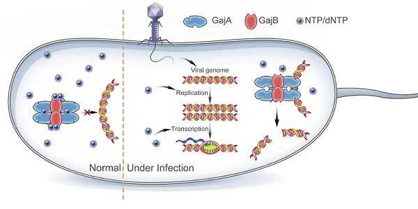 为了应对噬菌体的入侵,原核生物演化出多种精巧的免疫系统以实现自我保护。对原核生物免疫系统的深入研究催生了多种具有里程碑意义的分子生物学工具,包括在分子克隆实验中广泛应用的限制性核酸内切酶系统,以及在基因编辑领域中大放异彩的CRISPR-Cas系统等。然而,细菌和古菌基因组中还有一大批功能尚不明确的原核免疫系统相关基因,其中Gabija基因在已测序细菌和古菌基因组中的出现率超过15%,是原核生物中最常见的抗噬菌体防御系统之一[1]。Gabija系统由GajA和GajB两种蛋白组成,GajA蛋白被鉴定为序列特异性的DNA缺刻核酸内切酶,其活性受到核苷酸浓度的严格调控;GajB蛋白被预测为类似Uvrd的解旋酶。携带Gabija系统的大肠杆菌对噬菌体侵染表现出强烈的免疫效果[2],但Gabija系统分子机器的组装形式及其保护原核生物免受噬菌体侵染的结构基础仍有待揭示。