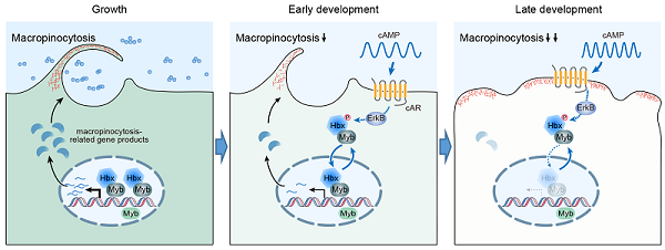 图:Hbx5-MybG转录因子复合体调控细胞营养生长和多细胞发育过程中巨胞饮水平的适应性变化
