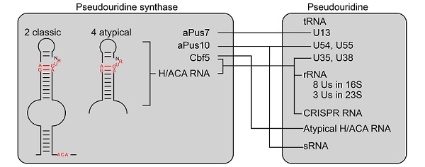 假尿嘧啶修饰是RNA中频率最高的修饰之一,存在于rRNA、tRNA、snRNA和mRNA等RNA中,能影响它们的结构和功能。假尿嘧啶是由属于六大家族的假尿嘧啶合成酶转化RNA上的尿嘧啶而来。其中属于TruB家族的Cbf5是个特殊的假尿嘧啶合成酶,它和其他三个蛋白质以及H/ACA RNA结合形成复合物,通过向导RNA识别底物。而其他假尿嘧啶合成酶由单独的蛋白质组成,直接识别底物。假尿嘧啶修饰的分布以及合成在真核生物和细菌中已经有较完整的研究,但是在第三类生物--古菌中还不完善。