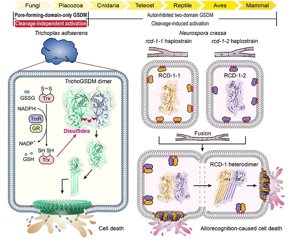 图:低等真核生物丝盘虫和粗糙脉孢菌编码只含有膜打孔结构域的GSDM蛋白,通过非蛋白酶切割的新颖方式激活膜打孔活性,执行细胞死亡的功能。