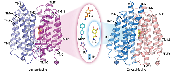 单胺类神经递质包括去甲肾上腺素、肾上腺素、多巴胺、血清素和组胺等,在神经系统和其他组织中发挥着重要的生理作用。其中,在神经系统中,去甲肾上腺素介导调节情绪,认知,疼痛等多种生理功能,同时它也影响大脑注意力和反应行为,诱发“战斗或逃跑”反应。多巴胺在调节运动和奖励方面发挥着重要作用,被认为与帕金森病和精神分裂症等精神疾病有关。而血清素则是"幸福感"的来源,同时也具有调节睡眠节律的作用。囊泡单胺转运蛋白(VMAT2)是中枢神经系统中唯一介导单胺类神经递质储存的转运蛋白。它利用质子的电化学势,以2:1的质子与底物的化学计量比,将神经递质或神经毒素MPP+转运进入囊泡中,在介导神经冲动传递和神经保护方面发挥着至关重要的作用。
