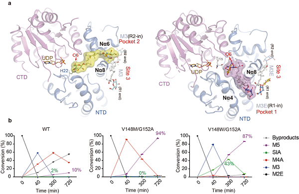 该项研究报道了糖基转移酶 SgUGT94-289-3 的多种复合物结构和酶学特性,发现 SgUGT94-289-3 在其活性位点形成双底物口袋(图1a),这使得罗汉果苷的两个结构不同的反应端可以从不同的口袋被递送到活性位点进行糖基化反应,从而在实现底物混杂性的同时保持催化区域选择性。通过基于结构的定向改造,研究者进一步确定了对催化活性和区域选择性至关重要的结构基序,获得了M5/SIA 产量显著提高的SgUGT94-289-3 突变体(图1b)。