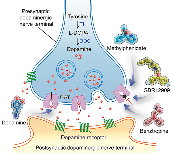 多巴胺是一种被深入研究的"快乐"神经递质,也是大脑中含量最丰富的儿茶酚胺类神经递质,能激发人的愉悦感和满足感。它在多巴胺能神经元末梢合成,释放到突触间隙之后,激活突触前膜或突触后膜上的多巴胺受体,参与调控大脑中认知、运动、情绪和奖励等相关过程的信息传递。位于突触前膜的多巴胺转运蛋白(dopamine transporter,DAT)负责回收突触间隙中的多巴胺进入突触前神经元,从而终止多巴胺神经信号传递,维持中枢神经系统多巴胺的稳态平衡。许多精神疾病,如抑郁症、双相情感障碍、帕金森综合征和注意缺陷多动障碍,都与异常的多巴胺水平有关。由于DAT在调控多巴胺神经传递的空间和时间动态中发挥着至关重要的作用,其逐渐成为治疗这些疾病的关键靶点。
