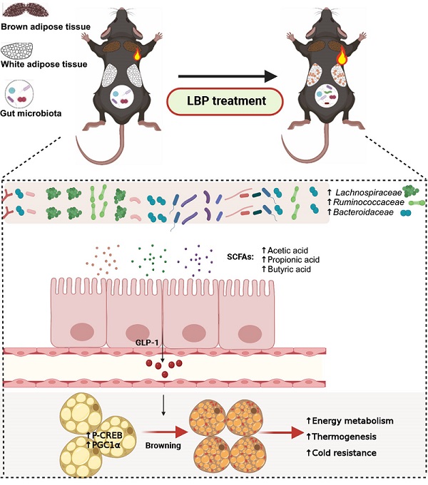 陈畅研究组以C57BL/6小鼠为模型,通过枸杞多糖长期处理,发现枸杞多糖有助于维持冷刺激条件下小鼠的体温,这一效应通过促进白色脂肪组织的棕色化、增加能量消耗和增强产热功能来实现。进一步机制研究发现枸杞多糖的补充增加了小鼠肠道菌群中Bacteroidetes的丰度,并降低了Firmicutes/Bacteroidetes的比例,增加了短链脂肪酸产生菌如LachnospiraceaeRuminococcaceaeBacteroidaceae的丰度和盲肠内容物中短链脂肪酸的水平,令人兴奋的是,肠道GLP-1的释放水平增加,并通过激活iWAT中的CREB/PGC1α信号通路,增加能量消耗而增强产热功能。传统中医古籍记载了多种中药具有"耐寒暑"的功效,但其功效的具体机制缺乏科学证据。该研究首次揭示了中药"耐寒暑"功效的科学内涵,为其它具有"耐寒暑"功效中药的原理解读提供了科学的参照依据,同时枸杞多糖有望成为高寒地区人群的安全膳食补充剂。