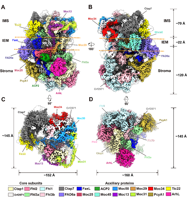 A-B,复合物的侧面图,不同亚基用不同颜色显示(IEM内膜区域用橘色线条指出);C-D,复合物的顶端(C)和底部(D)视角。